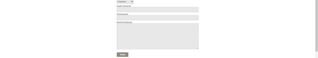 Vor- & Nachname Strasse PLZ-Ort Firma email-Adresse Telefon Zimmerauswahl VollpensionHalbpensionFrühstückSelbstversorgung Anzahl Teilnehmer Terminwunsch Nachricht (optional)