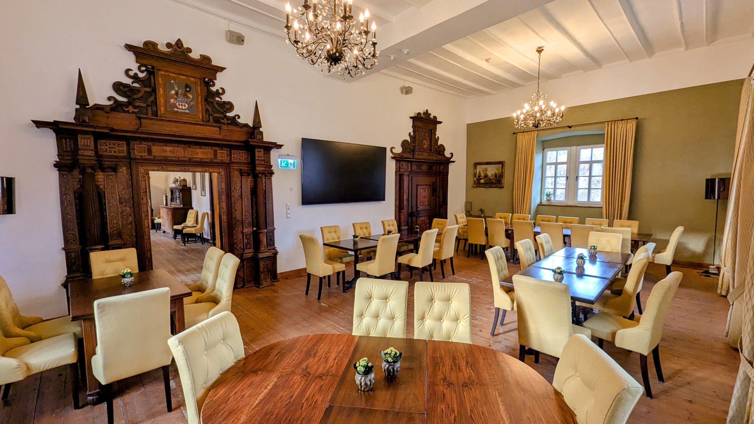 historischer Raum mit Renaissancetüren von 1618 im Schloss 1. OG. Der Raum atmet Geschichte, Sie haben die Möglichkeit ihn als Seminarraum bzw. Essensraum zu nutzen. Auch einem gemütlichen Abend dient er vorzüglich.